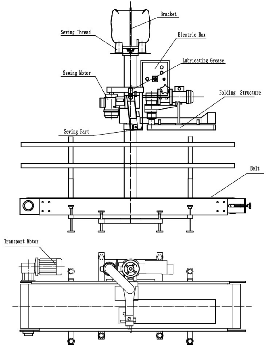 1. It is consisting of belt conveyor, sewing machine, folding structure, post and electric control system.